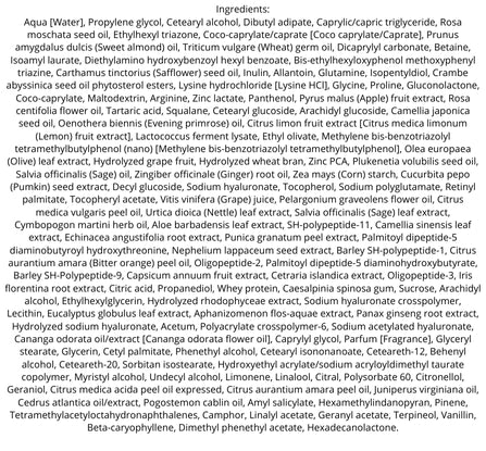 Contiene un mix bilanciato di attivi naturali e tecnologia cosmetica, tra cui acido ialuronico, peptidi rigeneranti, vitamine, antiossidanti, oli vegetali ed estratti botanici come rosa mosqueta, camelia giapponica, aloe vera, ginseng e melograno. Questi ingredienti nutrono in profondità, proteggono dai radicali liberi, stimolano la produzione di collagene ed elastina e favoriscono una prolungata idratazione.