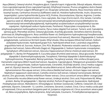 – Antiossidanti, filtri UVA/UVB, oli essenziali calmanti (lavanda, camomilla, salvia, rosa)