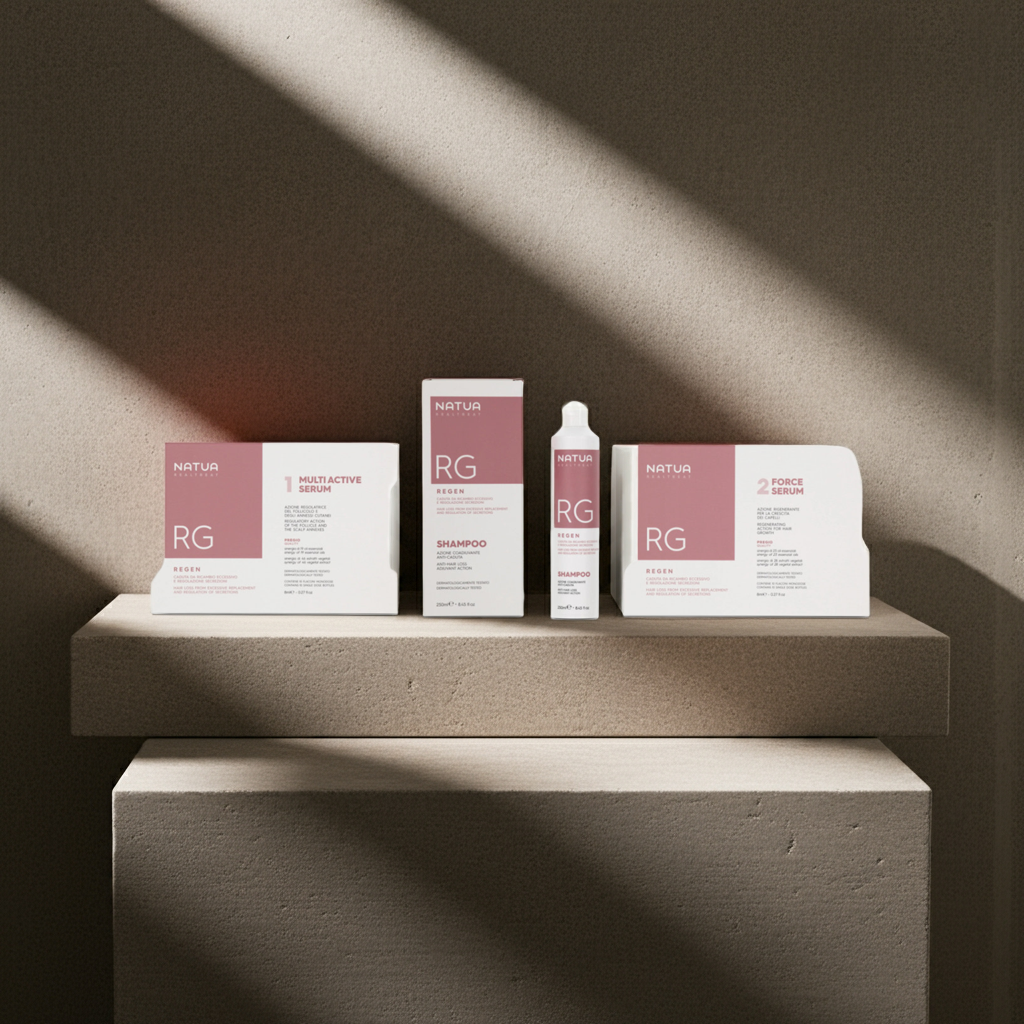 Il trattamento completo REGEN è un percorso mirato per contrastare la caduta prematura, stimolare la ricrescita e rinforzare i capelli fin dalla radice.