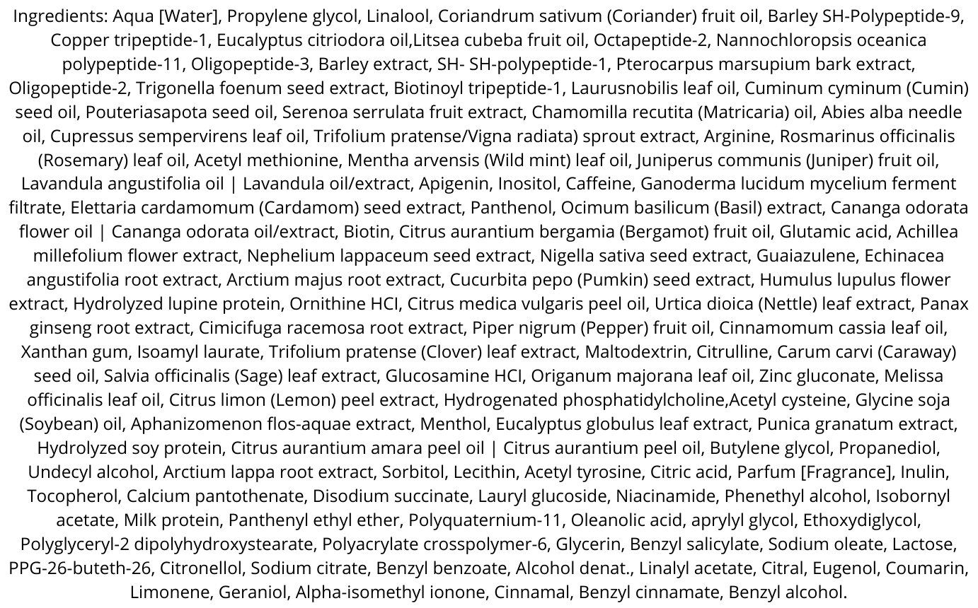 Ingredients: Aqua [Water], Propylene glycol, Linalool, Coriandrum sativum (Coriander) fruit oil, Barley SH-Polypeptide-9, Copper tripeptide-1, Eucalyptus citriodora oil,Litsea cubeba fruit oil, Octapeptide-2, Nannochloropsis oceanica polypeptide-11, Oligopeptide-3, Barley extract, SH- SH-polypeptide-1, Pterocarpus marsupium bark extract, Oligopeptide-2, Trigonella foenum seed extract, Biotinoyl tripeptide-1, Laurusnobilis leaf oil, Cuminum cyminum (Cumin) seed oil, Pouteriasapota seed oil, Serenoa serrulata fruit extract, Chamomilla recutita (Matricaria) oil, Abies alba needle oil, Cupressus sempervirens leaf oil, Trifolium pratense/Vigna radiata) sprout extract, Arginine, Rosmarinus officinalis (Rosemary) leaf oil, Acetyl methionine, Mentha arvensis (Wild mint) leaf oil, Juniperus communis (Juniper) fruit oil, Lavandula angustifolia oil | Lavandula oil/extract, Apigenin, Inositol, Caffeine, Ganoderma lucidum mycelium ferment filtrate, Elettaria cardamomum (Cardamom) seed extract, Panthenol, Ocimum basilicum (Basil) extract, Cananga odorata flower oil | Cananga odorata oil/extract, Biotin, Citrus aurantium bergamia (Bergamot) fruit oil, Glutamic acid, Achillea millefolium flower extract, Nephelium lappaceum seed extract, Nigella sativa seed extract, Guaiazulene, Echinacea angustifolia root extract, Arctium majus root extract, Cucurbita pepo (Pumkin) seed extract, Humulus lupulus flower extract, Hydrolyzed lupine protein, Ornithine HCI, Citrus medica vulgaris peel oil, Urtica dioica (Nettle) leaf extract, Panax ginseng root extract, Cimicifuga racemosa root extract, Piper nigrum (Pepper) fruit oil, Cinnamomum cassia leaf oil, Xanthan gum, Isoamyl laurate, Trifolium pratense (Clover) leaf extract, Maltodextrin, Citrulline, Carum carvi (Caraway) seed oil, Salvia officinalis (Sage) leaf extract, Glucosamine HCI, Origanum majorana leaf oil, Zinc gluconate, Melissa officinalis leaf oil, Citrus limon (Lemon) peel extract, Hydrogenated phosphatidylcholine,Acetyl cysteine, Glycine soja (Soybean) oil, Aphanizomenon flos-aquae extract, Menthol, Eucalyptus globulus leaf extract, Punica granatum extract, Hydrolyzed soy protein, Citrus aurantium amara peel oil | Citrus aurantium peel oil, Butylene glycol, Propanediol, Undecyl alcohol, Arctium lappa root extract, Sorbitol, Lecithin, Acetyl tyrosine, Citric acid, Parfum [Fragrance], Inulin, Tocopherol, Calcium pantothenate, Disodium succinate, Lauryl glucoside, Niacinamide, Phenethyl alcohol, Isobornyl acetate, Milk protein, Panthenyl ethyl ether, Polyquaternium-11, Oleanolic acid, aprylyl glycol, Ethoxydiglycol, Polyglyceryl-2 dipolyhydroxystearate, Polyacrylate crosspolymer-6, Glycerin, Benzyl salicylate, Sodium oleate, Lactose, PPG-26-buteth-26, Citronellol, Sodium citrate, Benzyl benzoate, Alcohol denat., Linalyl acetate, Citral, Eugenol, Coumarin, Limonene, Geraniol, Alpha-isomethyl ionone, Cinnamal, Benzyl cinnamate, Benzyl alcohol.