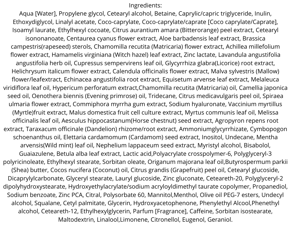 – estratti vegetali: achillea, calendola, camomilla, echinacea, elicriso, fiordaliso, hamamelis, mirtillo